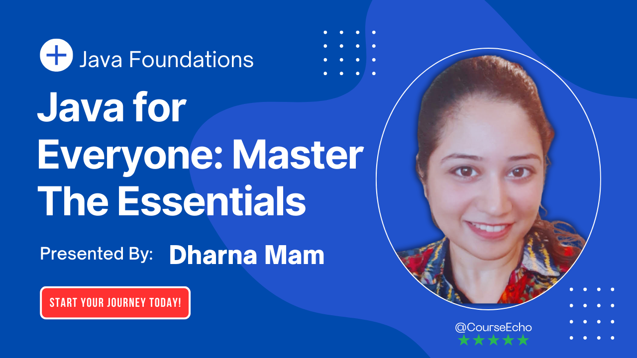 Master the essentials of Java programming with Mrs. Dharna! Learn variables, OOP concepts, exception handling, collections, streams, file handling, multi-threading, and database connectivity to build robust and scalable applications. Perfect for beginners aiming to excel in Java development.